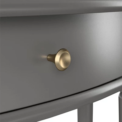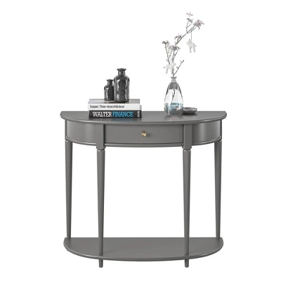 Give your living room or entryway a glow-up with a beautiful new Half-Moon Console Table. The classic elegance of the half-moon top and tapered legs create a vintage yet sophisticated feel perfect for any dĂ©cor. This half-moon Console Table features a spacious drawer to keep clutter out of sight and a lower shelf for books, photos, or other decorative items to cozy up the room. Made sturdy painted MDF, the Console Table is as durable as it is affordable and assembly is a snap! With the preassembled tabletop and drawer all ready to go right out of the box, just attach the legs and bottom shelf, and you’re off to more important things, like basking in the ambiance of a well decorated room. Complete the look with the entire collection. The Console Table ships flat to your door in one box. Assembly is required. Two adults are recommended to assemble. Once assembled, the Console Table measures to be 35.9″ W x 14″ D x 30″ H.