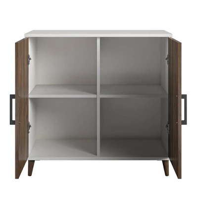 Add valuable and stylish storage to your home with the Room & Joy Berkhardt Accent Cabinet. The beautiful two-tone finish on the laminated particleboard gives the Cabinet a high end look at a fraction of the cost. Behind the 2 doors are 2 adjustable and 2 fixed shelves to store away board games, office supplies, or extra throws. Place a coffee maker on top to create a trendy mid-century modern coffee bar or put a printer on top for a stylish storage cabinet for your home office. The possibilities are endless with this versatile Cabinet. The Cabinet ships flat to your door and requires assembly upon opening. Two adults are recommended to assemble. Once assembled, the Cabinet measures to be 30.71”H x 31.65”W x 15.71”D.