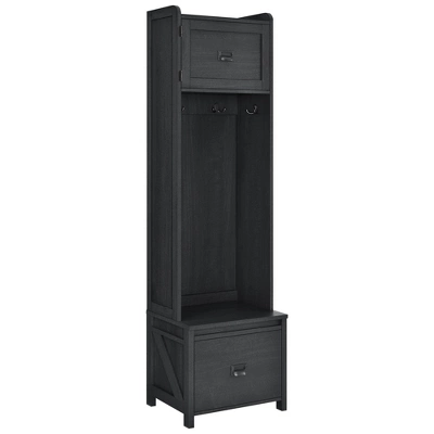Create an inviting entrance into your home with the Room & Joy Brookside Entryway Hall Tree with Storage Bench. Drawer provides space to store away shoes or blankets and features durable metal slides and store away hats and scarves behind the top door or hang them along with coats and bags on the 4 metal hooks. The woodgrain finish on the laminated MDF and particleboard along with the rustic barn style design give the Entryway Hall Tree rustic charm. The bench can support 200lbs. and each hook will hold 5lbs. Space behind the door and the drawer each holds 15lbs.