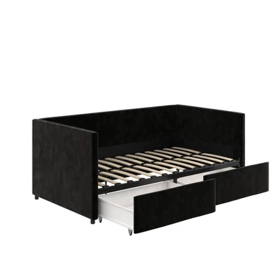 Sublime minimalism meets supreme comfort and functionality with the Room & Joy Cooper Urban Daybed with Storage. A classic design that embodies refined style, this daybed provides convenience and charm in any bedroom setting. Upholstered in clean linen, the cubical shape introduces forms and functions into the heart of your home with additional storage drawers underneath the bed to maximize ultimate in-space functionality. Use the drawers to store extra bedsheets, comforters, and magazines and simply roll in and out whenever needed. The Cooper is constructed in robust wood frame with premium wooden slats system, this allows air to flow freely beneath your mattress, keeping it fresher longer. No box spring is required, just top this daybed with your favorite mattress and simply sleep the night away. Get your creative juice flowing by adding some colorful cushions and duvets to turn this daybed into a lounging area. Designed to fit a twin mattress. Ideal for small space living, guest room, studio apartment or child’s room.
