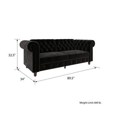 Transform your living room with a vintage inspired piece: the Room & Joy Finnley Sofa Futon. Luxuriously detailed with diamond button-tufted detailing throughout its entirety, this fashion-forward futon is perfect for any small living spaces. What’s more, the wooden legs and plush rolled arms add an element of Victorian era style to complete the look. Designed with a split backrest, simply push and pull your futon to instantly convert it into a lounger or bed. Founded with sturdy wood, we promise to deliver optimal stability and durability for the years to come. The futon is easy to assemble and can hold up to 600lb. No more stressing about staining your futon as it can be easily cleaned with a damp cloth. Available in a variety of colors including: Green velvet, Blue velvet and gray velvet. Go back in time with the Room & Joy Finnley Sofa Futon.