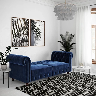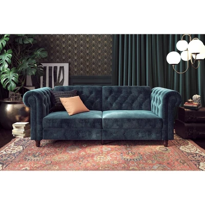 Transform your living room with a vintage inspired piece: the Room & Joy Finnley Sofa Futon. Luxuriously detailed with diamond button-tufted detailing throughout its entirety, this fashion-forward futon is perfect for any small living spaces. What’s more, the wooden legs and plush rolled arms add an element of Victorian era style to complete the look. Designed with a split backrest, simply push and pull your futon to instantly convert it into a lounger or bed. Founded with sturdy wood, we promise to deliver optimal stability and durability for the years to come. The futon is easy to assemble and can hold up to 600lb. No more stressing about staining your futon as it can be easily cleaned with a damp cloth. Go back in time with the Room & Joy Finnley Sofa Futon.
