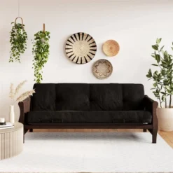 The Room & Joy Chester Wood Arm Futon Frame with 8″ Thermobonded High Density Polyester Fill Futon Microfiber Mattress is the ideal addition for any living space. Featuring solid wood arms with a walnut finish, it will surely compliment any room dĂ©cor. This futon quickly and easily converts from sofa to full size bed to help you sleep or sit in ample comfort. This mattress is built to hold up to everyday use. The foldable design ensures that the mattress will retain its original shape and its attractive tufted stitching adds a pop of style to your living areas. Suitable for any room dĂ©cor, this futon is just the seating accessory that you need to add to your relaxed home. It also makes a great mattress to accommodate overnight guests or for when you need to catch a quick nap after a long tiring day. Featuring an easy to clean microfiber cover and a cozy polyester fiber pad filling, you can’t go wrong with this quality GREENGUARD Gold Certified mattress. Assembled in Canada, add the versatile Room & Joy Chester Wood Arm Futon Frame with 8″ Thermobonded High Density Polyester Fill Futon Microfiber Mattress to your living room, den, guest bedroom or home office to maximize space saving efficiency.