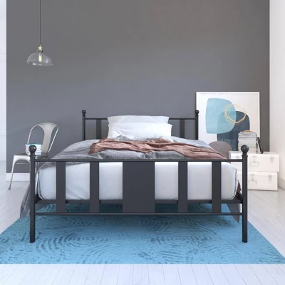 Bring a fused classical and contemporary charm to your bedroom with the Room & Joy Lisa Metal Bed. This unique bed features a stunning frame designed with one of a kind black rectangular strips on both its headboard and footboard. This bold luxurious detailing is guaranteed to make a real statement to your bedroom. The black metal frame is both sturdy and durable, providing you comfort for years to come. No need to buy a box spring or additional foundation as this carefully crafted bed frame requires only a mattress (sold separately). Dress up the bed with your favourite throw pillows and blankets or keep it simple with light toned bedding. Ships in one box for stress-free handling and easy to assemble. The Lisa Queen Metal Bed can support up to 500lb. Available in full and queen sizes to suit your space. Treat yourself with a well deserved stylish and comfortable bed.