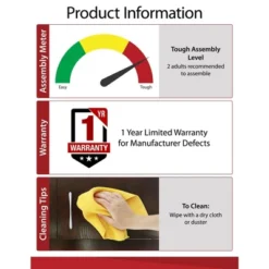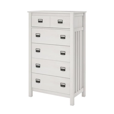Keep your clothes from piling up by using the Room & Joy Melody 5 Drawer Dresser. The classic woodgrain finish on the laminated MDF and particleboard pairs with the decorative side panels for a beautiful mission style piece you will enjoy for years to come. The top drawer front features detailed grooves for the look of 2 drawers but is spacious enough to store your folded clothing. Organize T-Shirts , pants, pajamas, and extra sheets in the 5 drawers with durable metal slides for a smooth and easy gliding drawer. The linen-look paper on the inside of each drawer prevents clothes from snagging on raw edges and gives the Dresser a completed look. A wall anchor kit is included to secure the Dresser to the wall and prevent tipping injuries. The Dresser ships flat to your door and requires assembly upon opening. Two adults are recommended to assemble. Once assembled, the Dresser measures to be 53.05″H x 31.77″W x 18.62″D.