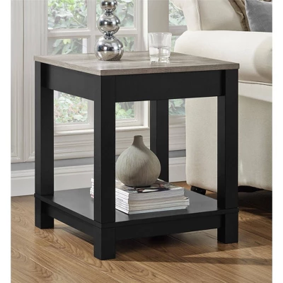 Add extra style to your living room with the Room & Joy Paramount End Table. This item is beautiful and functional. The top surface of the End Table is the perfect spot for your lamp or family photos while the lower shelf can be used to keep books and magazines in one handy space. The Paramount End Table features a matte finish with a distressed woodgrain top that creates a refined, clean look in your home. After assembled, the End Table measures to be 23.3″h x 20.1″w x 20.1″d.