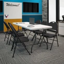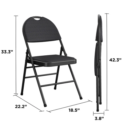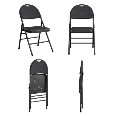 Sit back and relax using this Room & Joy XL Comfort Premium Fabric Padded Metal Folding Chair for your next activity or get together! The perfect seating solution for any gathering, this chair is multipurpose making it great for banquets, graduation celebrations, and provides extra seating for guests. No matter the occasion, this chair is here to serve all of your seating needs! Featuring a comfortable and luxurious thick fabric padded seat and back, this chair provides comfort to support you during all activities. Available in a sleek and sophisticated all black color to match any household décor and personal aesthetic. This chair features non marring foot caps that helps to protect your floors from any scratches or damage. Before storing, simply wipe down this easy to clean chair using a damp cloth. When not in use, you can easily fold this chair for flat, compact storage. Includes a convenient handle hole for lightweight and easy transportation. Built to last, this commercial rated chair includes three cross braces and is constructed of durable all-steel. Features a weight capacity rating of up to 300 pounds and comes standard with a 1-year, limited warranty.