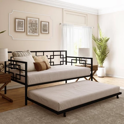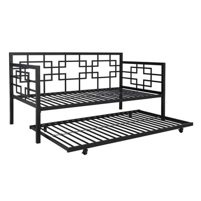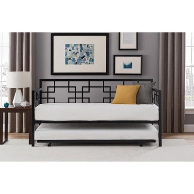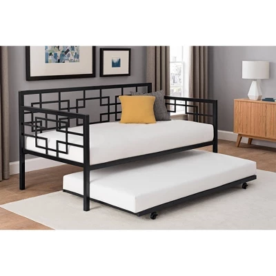 Save on space while adding style to your home with the Room & Joy Gemma Twin Daybed with Trundle. This space-saving solution is perfect for growing family, shared bedroom and guest room. Constructed with sturdy metal, the sleek and decorative metal adds a flair of modern luxury to any interior. The trundle neatly tucks away under the daybed for the ultimate in-space functionality, making it ideal when hosting overnight guests. the trundle also comes with caster wheels that lock in place, ensuring a restful night of sleep. Both the bed and trundle are equipped with premium secured metal slats that provide even weight distribution and air circulation. Designed to fit one standard twin size mattress on daybed (maximum 8 inches) and one standard twin size mattress on trundle (maximum 6 inches) – both sold separately. The Gemma is a nice lounging area by day, and a stylish bed at night. Just top it with a blanket, and colorful pillows and you are all set! Available in multiple colors, the Room & Joy Gemma Twin Daybed with Trundle ships in one box and it is easy to assemble.